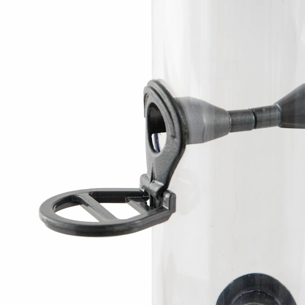 Der Durchmesser dieser Futtersäule ist extra breit (8,5 cm), wodurch sich auch die Füllmenge erhöht. Vor den sechs Öffnungen befinden sich Sitzringe, von denen aus die Vögel in einer natürlichen Haltung fressen können. Deckel und Futteröffnungen sind aus Aluminium gefertigt und besitzen eine dunkelgraue Farbe. Bei dieser Futtersäulenausführung ist die Montage einer Auffangschale oder eines Futtersäulenschutz möglich.