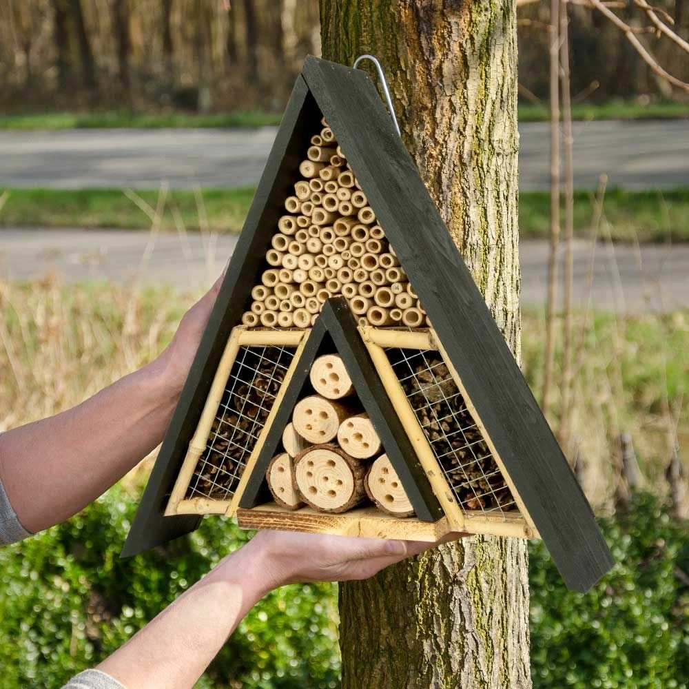 Das Insektenhotel „Menorca“ wurde für verschiedene Insektenarten entwickelt. In den Tannenzapfen und losen Holzstückchen können sich Insekten, wie z.B. Marienkäfer, einnisten. Die unterschiedlichen Röhrchen bieten Solitärbienen einen idealen Ort für die Eiablage.