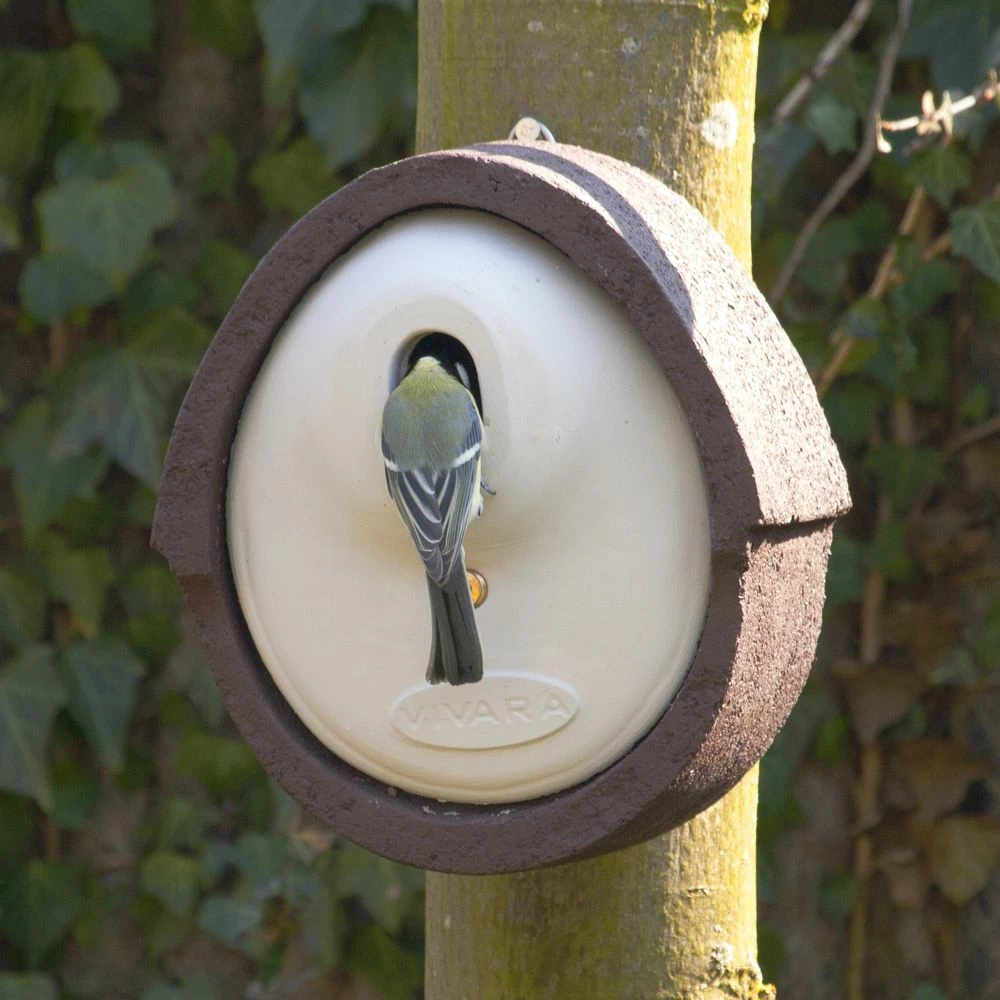 Die ovale Einflugöffnung eignet sich besonders für Meisen, Sperlinge, Kleiber sowie Trauerschnäpper und Rotschwanz. Der Kasten ist mit einem Marderschutz ausgestattet und besteht aus WoodStone bzw. Holzbeton, einer speziellen Mischung aus Beton und Holzfasern, welche besonders isoliert und atmungsaktiv ist. In den Wintermonaten schützt das Material gegen Kälte, im Sommer verhindert es Überhitzung. Die konstante Temperatur im Kasten erhöht zudem die Überlebenschancen der Jungvögel erheblich.