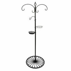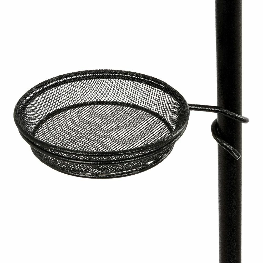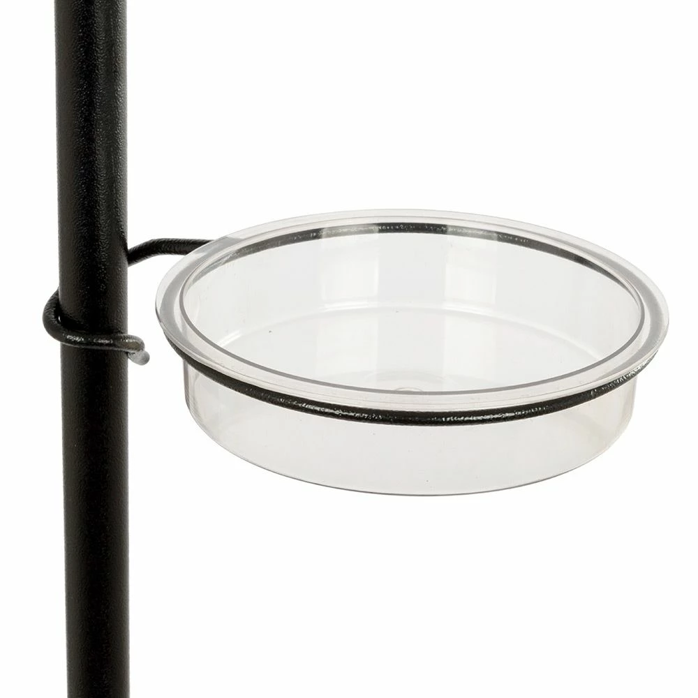 Einfach die Futtersäulen und Futterhäuser an dem Haken am Ende der beiden Arme dieses Pfahlsystems aufhängen. Weiter unten können Sie noch einen zusätzlichen Haken für kleinere Leckerbissen befestigen sowie zwei Schalen montieren: eine für Futtermischungen oder Mehlwürmer, eine für frisches Wasser.