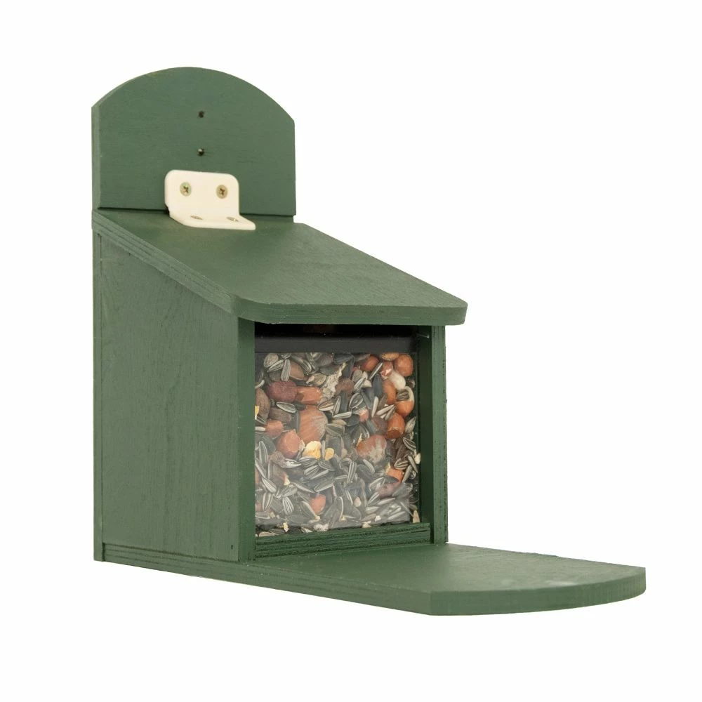 Der Futterspender für Eichhörnchen aus Holz wurde von Vivara in Zusammenarbeit mit den Experten mehrerer Naturschutzorganisationen entwickelt. Das Futter in der Futterkammer bleibt für Vögel unzugänglich, während die cleveren Eichhörnchen den Deckel anheben, das gewünschte Futter entnehmen und auf dem angebrachten Sitzbrett in Ruhe fressen können. Zugleich schützt der Deckel das Futter vor Regen oder Schnee.